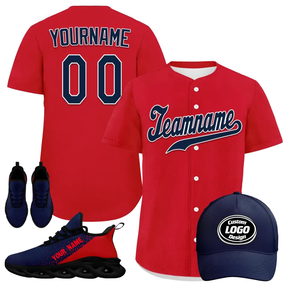 Introducing our Personalized Baseball Combo Deal, a must-have for any baseball enthusiast! This custom stylish set includes a pair of sleek sneakers, a trendy hat, and a comfortable jersey, all personalized to showcase your team spirit. Made with high-quality materials, our teamwear is designed for ultimate comfort and style on and off the field. Don't miss out on this exclusive combo deal, perfect for players and fans alike!
