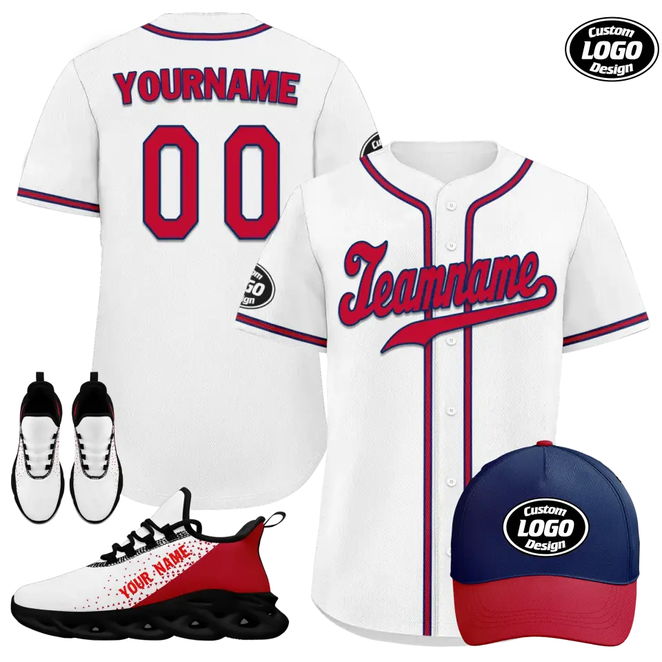 Introducing our Personalized Baseball Combo Deal, a must-have for any baseball enthusiast! This custom stylish set includes a pair of sleek sneakers, a trendy hat, and a comfortable jersey, all personalized to showcase your team spirit. Made with high-quality materials, our teamwear is designed for ultimate comfort and style on and off the field. Don't miss out on this exclusive combo deal, perfect for players and fans alike!